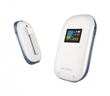 Ultra-compact and accurate Dr Finder Apex Locator from South Korea, offering clinicians a user-friendly endodontic measuring device. Features include a color OLED display, Working Length Select (W.L.S.) adjustment, and three-frequency measurement for enhanced accuracy. Rechargeable via mini-USB (3.7V Li-polymer), the device contains essential accessories—file hook, three lip hooks, and probe cord—for a complete clinical setup.